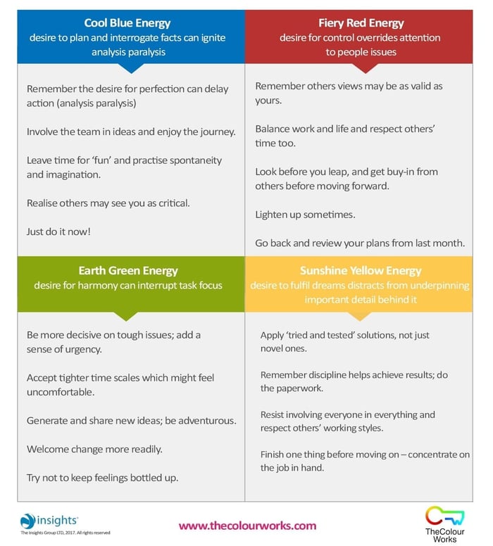 Add the Personal Achievement chapter to your Insights Discovery profile. You can see a sample starting on page 32 of the full profile here. The chapter explores how an individual can grow and improve in different areas of personal achievement and includes the sections Living on Purpose, Life & Time Management, Personal Creativity, Life Long Learning & Learning Style. It’s practical application spans far and wide: